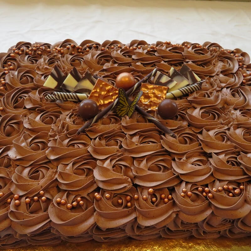 Kaken er bakt i eget bakeri, fylt med sjokoladekrem.
